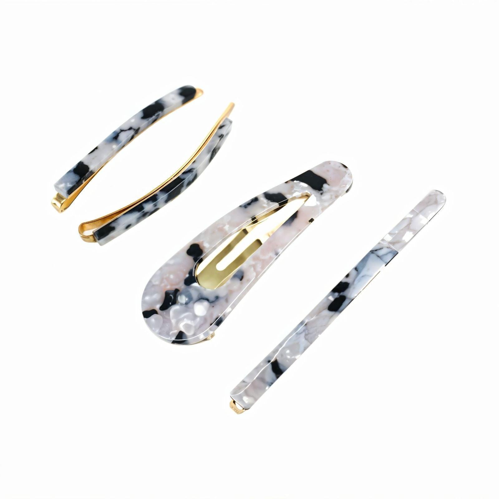 O Kit Clipe Marcela vem com 4 presilhas estilosas, em tons marmorizados e animal print, ideais para quem ama praticidade sem abrir mão do charme.