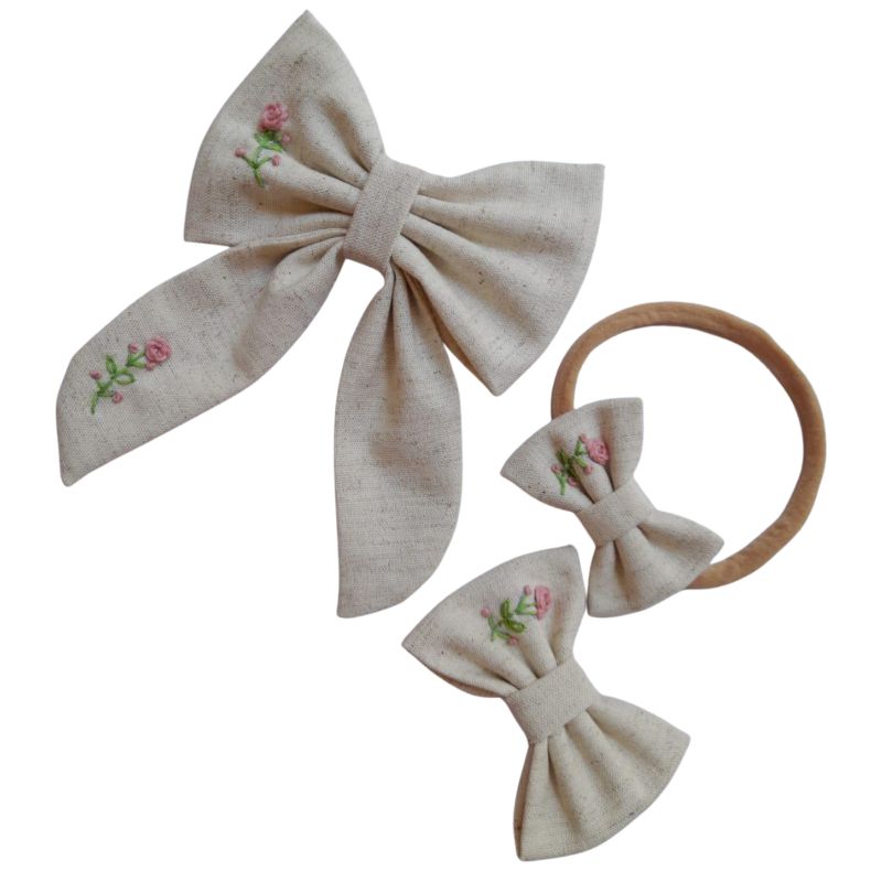 O Kit Laço Mãe e Filha traz todo o charme e delicadeza dos laços bordados à mão, perfeitos para combinar com looks especiais e momentos únicos.